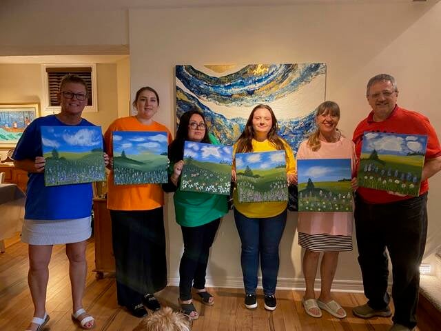 A typical team building paint party involves creating an acrylic painting with guided instruction. The subject matter can be decided by your group, ensuring a personalized and enjoyable experience for everyone. Parties are usually held in the evenings and we are located in Barrie, Ontario, Canada.